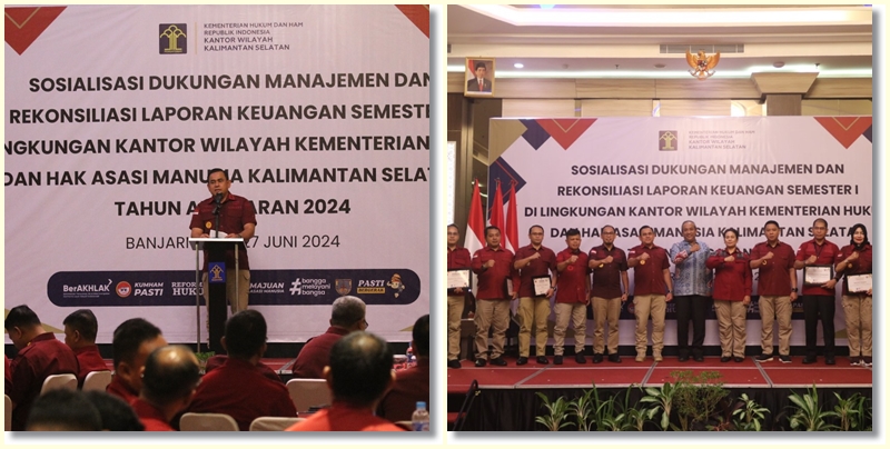 BANJARMASIN, KALIMANTANLIVE.COM – Kepala Kantor Wilayah Kementerian Hukum dan Hak Asasi Manusia Kalimantan Selatan (Kakanwil Kemenkumham Kalsel) Taufiqurrahman menghadiri sekaligus membuka kegiatan Sosialisasi Dukungan Manajemen dan Rekonsiliasi Laporan Keuangan Semester I di Lingkungan Kanwil Kemenkumham Kalsel Tahun Anggaran 2024.