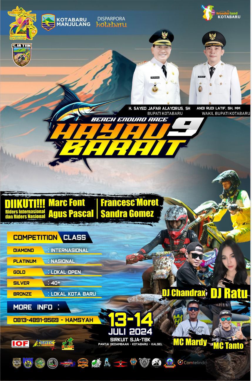 KOTABARU, KALIMANTANLIVE.COM – Pemerintah Kabupaten Kotabaru melalui Dinas Pariwisata, Pemuda dan Olahraga kembali menggelar Beach Enduro Race Hayau Barait 9 pada tanggal 13-14 Juli 2024 (Sabtu & Minggu) di Sirkuit SJA TBK Kotabaru.