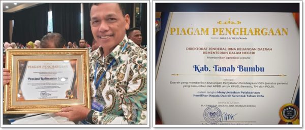 Penghargaan tersebut diberikan oleh Pelaksana Harian (Plh) Direktur Jenderal (Dirjen) Bina Keuda Kemendagri Horas Maurits Panjaitan yang diterima Bupati Tanbu, Zairullah Azhar melalui Kepala Badan Kesatuan Bangsa dan Politik (Kesbangpol) Kabupaten Tanah Bumbu, Nahrul Fajeri dalam Rapat Asistensi Pemenuhan Pendanaan Pemilihan Kepala Daerah (Pilkada) di Mercure Convention Centre Ancol, di Jakarta, pada Senin (15/7/2024).