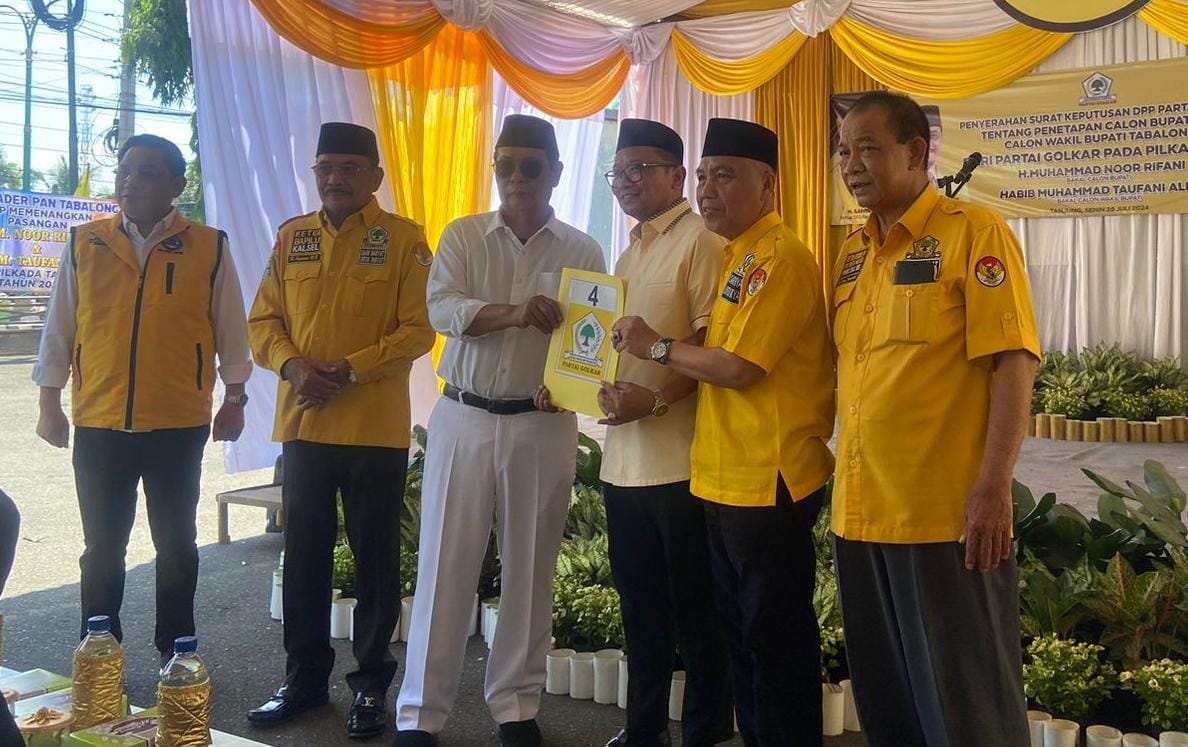 Hal itu ditandai dengan penyerahan SK DPP Golkar tentang penetapan bacabup oleh Ketua DPD Partai Golkar Kalimantan Selatan, H Sahbirin Noor alias Paman Birin di Halaman Kantor DPC Golkar Tabalong, Senin (29/07/2024).