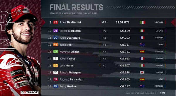 Keberhasil Enea Bastianini meraih podium pertama MotoGP Inggris 2024, mengulangi sukses saat Sprint Race, di mana dia berhasil menempati podium pertama setelah sempat berduel dengan Jorge Martin.