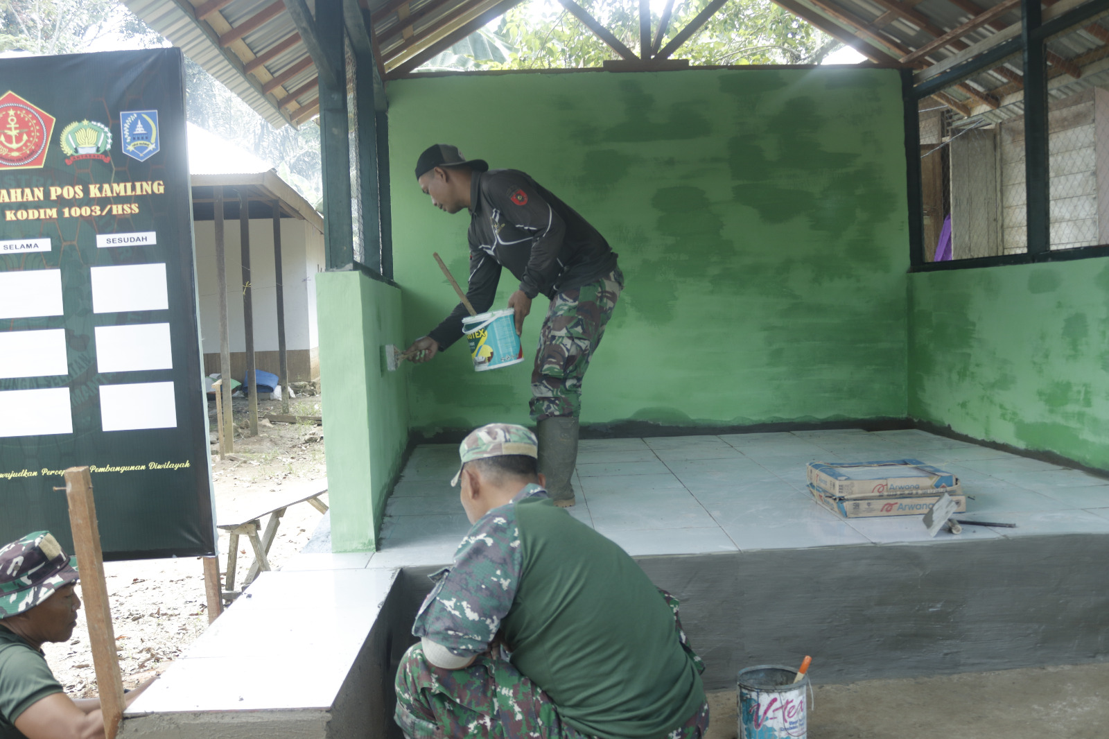 KANDANGAN, KALIMANTANLIVE.COM – Satuan Tugas (Satgas) TNI Manunggal Membangun Desa (TMMD) Ke 121 Kodim 1003/Hulu Sungai Selatan (HSS) bergotong-royong menyelesaikan pembangunan Pos Keamanan Lingkungan (Poskamling) Desa Gumbil Kecamatan Telaga Langsat yang hampir rampung, yakni pengecetan dan finishing.