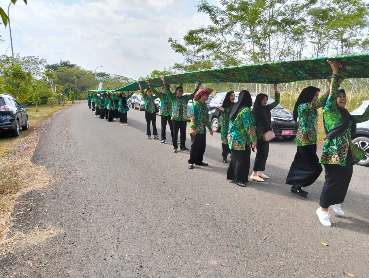 Masing-masing Satuan Kerja Perangkat Daerah (SKPD) yang mewakili Kabupaten Balangan membentangkan kain sasirangan sepanjang 50 meter dengan total 150 meter.
