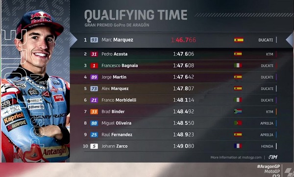 Marc Marquez yang tampil konsisten sejak latihan bebas, tampil percaya diri dikualifikasi dengan meraih catatan waktu 1 menit 47,478 detik. Di belangkannya dua pembalap Spanyol Pedro Acosta kedua, dan Jorge Martin di posisi ketiga.