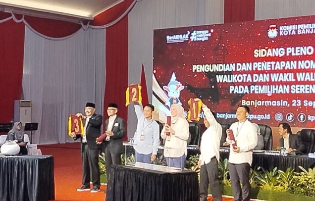 BANJARMASIN, Kalimantanlive.com – Komisi Pemilihan Umum (KPU) Kota Banjarmasin gelar Sidang Pleno Terbuka Pengundian dan Penetapan Nomor Urut Pasangan Calon Walikota dan Wakil Walikota Banjarmasin Pada Pemilihan Serentak Tahun 2024.
