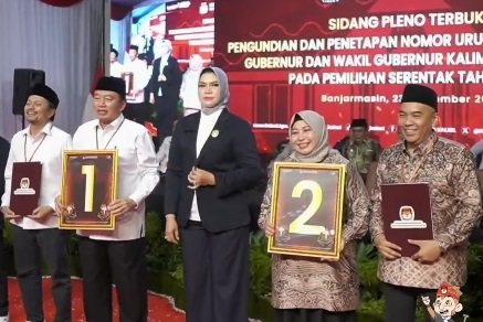 Dalam acara yang digelar oleh Komisi Pemilihan Umum (KPU) Kalsel pada Senin (23/9/2024) malam, pasangan Muhidin-Hasnuryadi Sulaiman berhasil mendapatkan nomor urut 1, sementara Raudatul Jannah-Akhmad Rozanie Himawan Nugraha, yang akrab disapa Acil Odah, mendapat nomor urut 2.