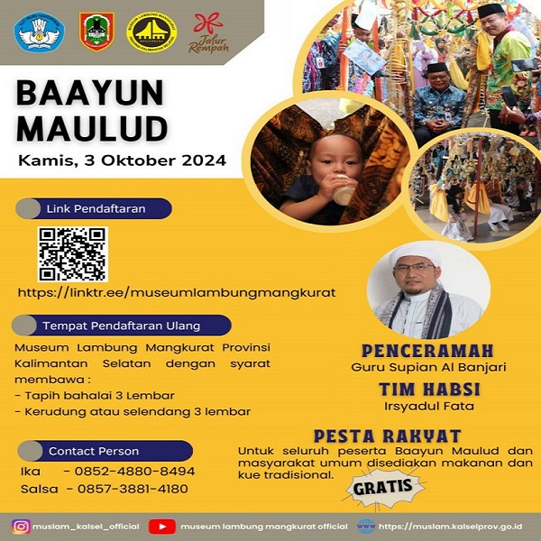 BANJARBARU, Kalimantanlive.com – Pemerintah Provinsi Kalimantan Selatan melalui UPTD Museum Lambung Mangkurat memperpanjang pendaftaran bagi masyarakat yang ingin mengikuti tradisi Baayun Maulid. Acara ini akan berlangsung pada 3 Oktober 2024 di halaman Museum Lambung Mangkurat, Banjarbaru.