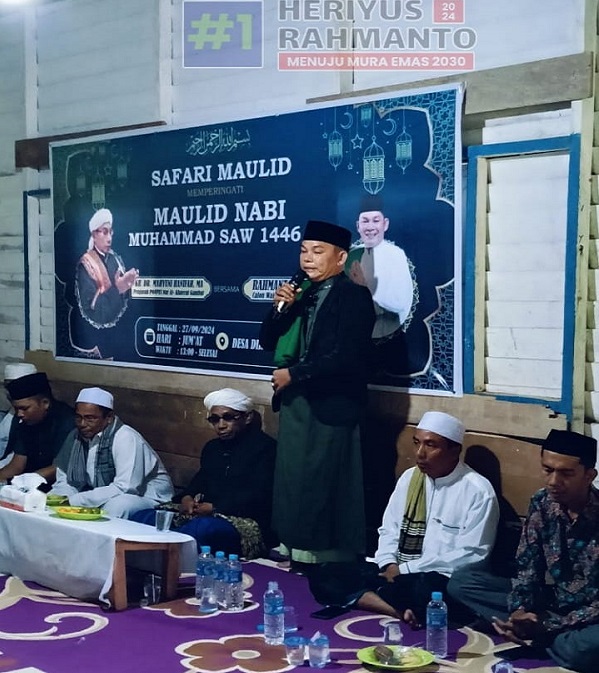 PURUK CAHU, Kalimantanlive.com – Calon Wakil Bupati Murung Raya, Rahmanto Muhidin, S.HI., MH., menghadiri kegiatan Safari Maulid Nabi Muhammad SAW yang diselenggarakan di Majelis Ta’lim Bengkel Hati, Desa Dirung Lingkin, Kecamatan Tanah Siang Selatan, Kabupaten Murung Raya pada Jumat, (27/09/2024).