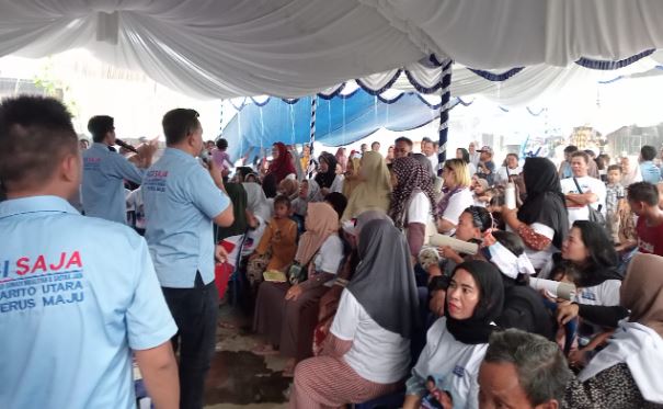 Ratusan warga bejibun memadati tempat kegiatan kampanye, bahkan sejak jam 12 siang. Sementara rombongan AGI SAJA baru tiba kelokasi acara sekitar jam setengah 4 sore. Hal itu karena AGI – SAJA sebelumnya harus melayat ke rumah duka salah satu warga.