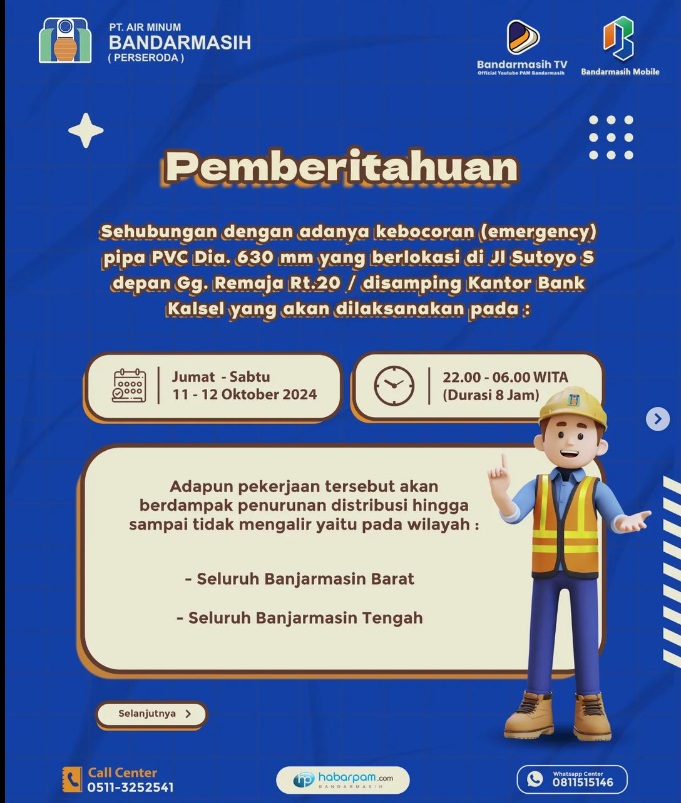 Gangguan distribusi air ini disebabkan oleh kebocoran pipa PVC berdiameter 630 mm yang terjadi secara darurat di Jalan Sutoyo S, depan Gang Remaja RT. 20, tepat di samping Kantor Bank Kalsel.