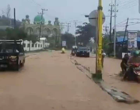 Di kawasan ini juga salah satu menjadi langganan banjir selain terjadi di ruas jalan. Halaman masjid di sekitarnga juga terdampak genangan air berwarna kecoklatan tersebut.