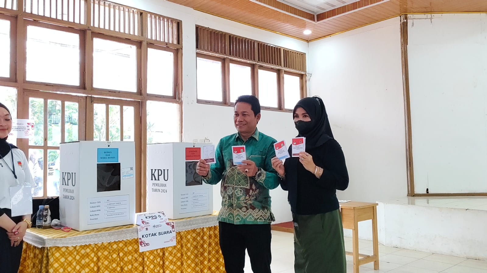 PARINGIN, KALIMANTANLIVE.COM – Bupati Balangan, H Abdul Hadi bersama istri, Hj Sri Huriyati Hadi berhadir di TPS 07, Aula SKB, Kelurahan Paringin Timur, Kecamatan Paringin untuk menggunakan hak pilih mereka dalam Pemilihan Kepala Daerah (Pilkada) tahun 2024, Rabu (27/11/2024).