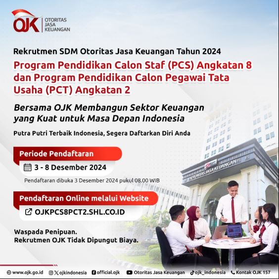 Persiapkan dirimu untuk mengikuti Rekrutmen SDM OJK melalui Program Pendidikan Calon Staf (PCS) Angkatan 8 dan Program Pendidikan Calon Pegawai Tata Usaha (PCT) Angkatan 2. Pendaftaran dibuka mulai 3 Desember 2024 pukul 08.00 WIB.