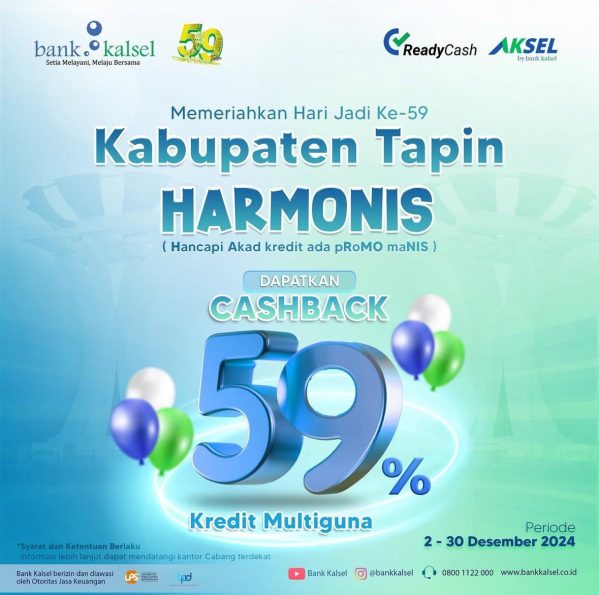 BANJARMASIN, Kalimantanlive.com – Dalam rangka merayakan Hari Jadi ke-59 Kabupaten Tapin, Bank Kalsel menghadirkan promo spesial yang penuh “manisnya” untuk masyarakat. Lewat program HARMONIS alias Hancapi Akad Kredit Ada Promo Manis, Anda bisa menikmati cashback langsung hingga 59% melalui pengajuan Kredit Multiguna Bank Kalsel.
