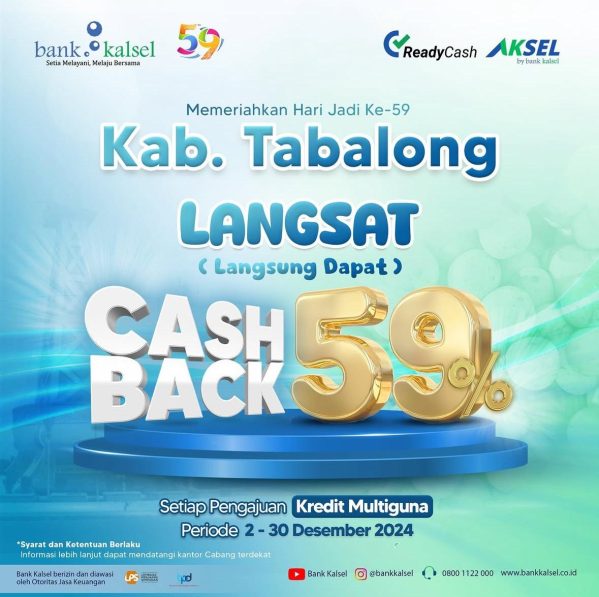 Program LANGSAT alias “Langsung Dapat” Cashback hingga 59% hadir sebagai solusi bagi Anda yang ingin memenuhi kebutuhan dengan mudah dan cepat. Promo eksklusif ini berlaku untuk pengajuan Kredit Multiguna Bank Kalsel selama periode 2 hingga 30 Desember 2024.