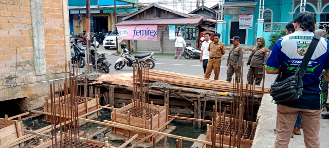 Pekerjaan bangunan dikerjakan sampai dengan tahapan rangka konstruksi cakar ayam, dihentikan lantaran dibangun di alur atau badan sungai.