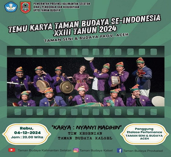 ACEH, Kalimantanlive.com – Pemerintah Provinsi Kalimantan Selatan (Pemprov Kalsel) menampilkan kesenian tradisional Madihin dalam ajang Temu Karya Taman Budaya (TKTB) Se-Indonesia XXIII yang berlangsung di Kota Banda Aceh, Provinsi Aceh. Kegiatan ini menjadi upaya memperkenalkan kekayaan budaya daerah Kalimantan Selatan kepada masyarakat luas.