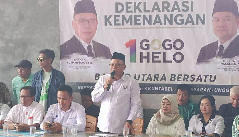 MUARA TEWEH, KALIMANTANLIVE.COM – Pasangan calon bupati dan wakil bupati Barito Utara Nomor Urut 01 Gogo Purman Jaya langsung melakukan deklarasi kemenangan, setelah rekapitulasi resmi Komisi Pemilihan Umum (KPU) Barito Utara mengumumkan keunggulan Gogo-Helo atas pasangan nomur urut 2 Akhmad Gunadi Nadalsyah-Sastra Jaya (Agi-Saja) dengan selisih 8 suara, Rabu (4/12/2024).