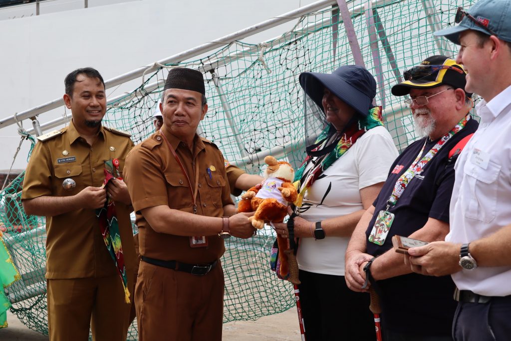 BANJARMASIN, KALIMANTANLIVE.COM – Gubernur Kalimantan Selatan, H Muhidin diwakili Kepala Dinas Pariwisata Kalsel, Muhammad Syarifuddin menyambut kedatangan Kapal Pesiar Coral Geographer berbendera negara Australia di terminal kedatangan Pelabuhan Tri Sakti Banjarmasin, Senin (6/1/2025).