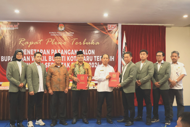 “Menetapkan Pasangan Calon Bupati dan Wakil Bupati Kotabaru Nomor Urut 1, Muhammad Rusli S.Sos dan Syairi Mukhlis. S.Sos dengan perolehan suara sebanyak 72.088 (Tujuh Puluh Dua Ribu Delapan) atau 44% (Empat Puluh Empat Persen) suara dari total sah, sebagai pasangan Calon Bupati dan Wakil Bupati Terpilih Kabupaten Kotabaru Periode Tahun 2025-2030 dalam Pemilihan Bupatindan Wakil Bupati Kotabaru Tahun 2024,” Ucapnya saat memimpin Rapat Pleno terbuka yang berlangsung di Hotel Grand Surya Kotabaru, Kamis (09/01/2025).