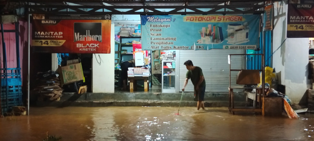Banjir juga disebabkan luapan air sungai, masuk ke dalam rumah warga. Lantaran air luapan tidak bisa mengalir ke seberang jalan karena terhalang bangunan median jalan.