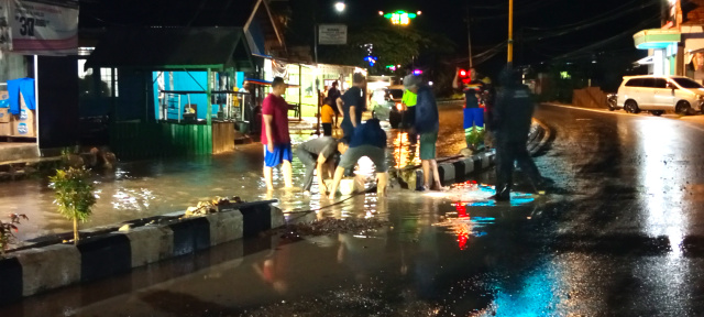 Pembongkaran bangunan median jalan oleh warga secara bergotong royong, pasca hujan mengguyur tadi sore air tidak hanya menggenangi badan jalan.