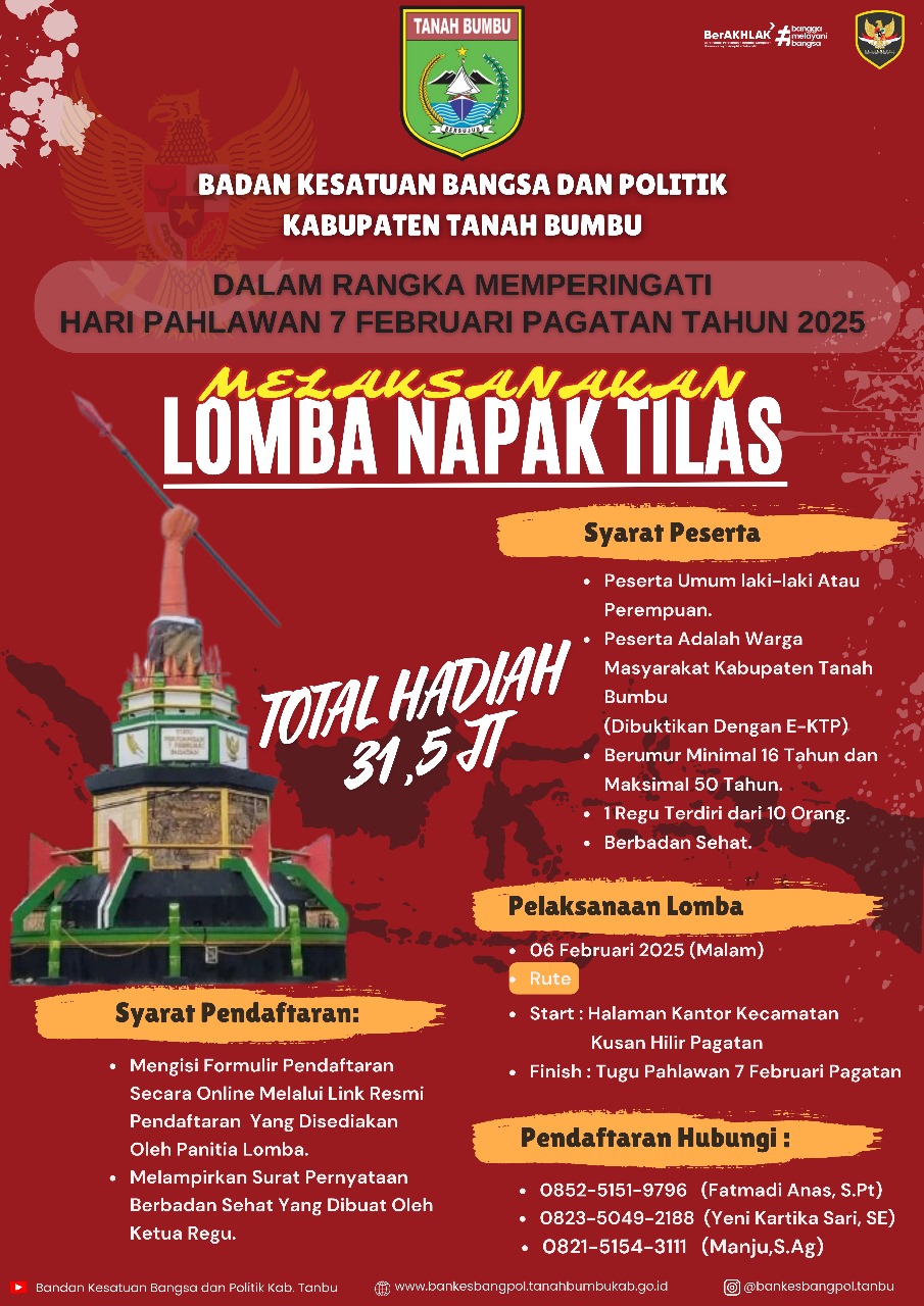 BATULICIN, KALIMANTANLIVE.COM – Badan Kesatuan Bangsa dan Politik (Bakesbangpol) Kabupaten Tanah Bumbu akan menggelar Lomba Napak Tilas dalam rangka memperingati Hari Pahlawan 7 Februari 2025.