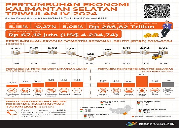 BANJARBARU, Kalimantanlive.com – Badan Pusat Statistik (BPS) Kalimantan Selatan (Kalsel) mencatat pertumbuhan ekonomi Kalsel pada triwulan IV-2024 sebesar 5,15 persen dibandingkan dengan periode yang sama di tahun sebelumnya (y-on-y).