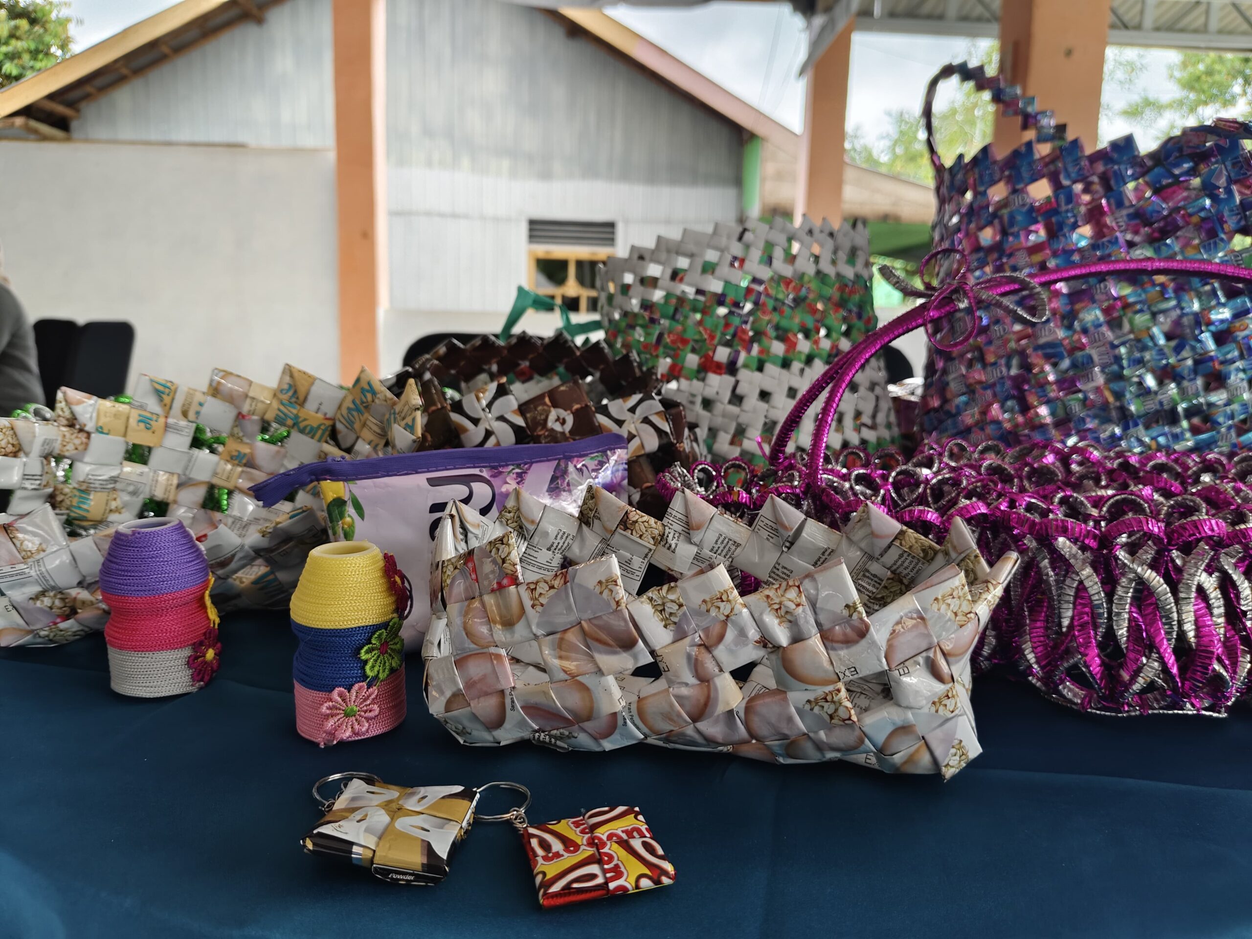 Kerajinan yang dihasilkan dari sampah plastik ini beragam, mulai dari gantungan kunci, tas, rak, dompet, hingga tikar.