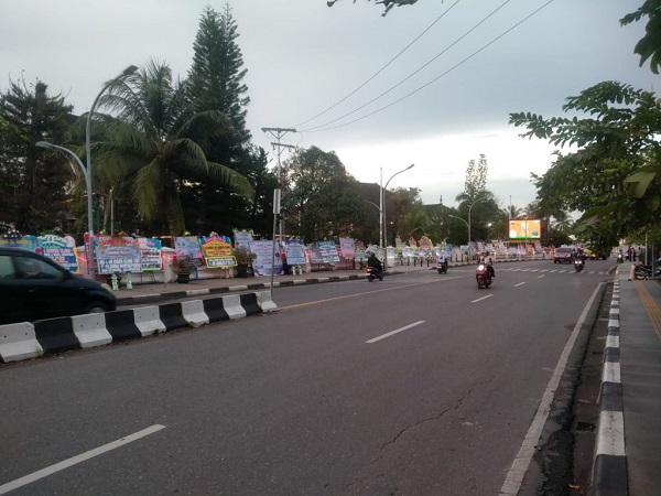 Pemandangan serupa juga terlihat di Kantor Gubernur Kalsel di Banjarbaru, di mana karangan bunga berjejer di depan kantor hingga area lobi.