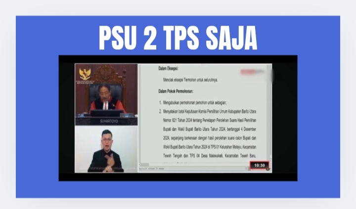 MUARA TEWEH, KALIMANTANLIVE.COM – “Mengadili, Dalam Pokok Permohonan: Mengabulkan Permohonan pemohon untuk sebagian” kata Ketua Mahkamah Konstitusi (MK) Suhartoyo saat membacakan amar putusan atas Permohonan Perkara Nomor 28/PHPU.BUP-XXIII/2025 Perselisihan Hasil Pemilihan Umum (PHPU) Bupati Barito Utara 2024.