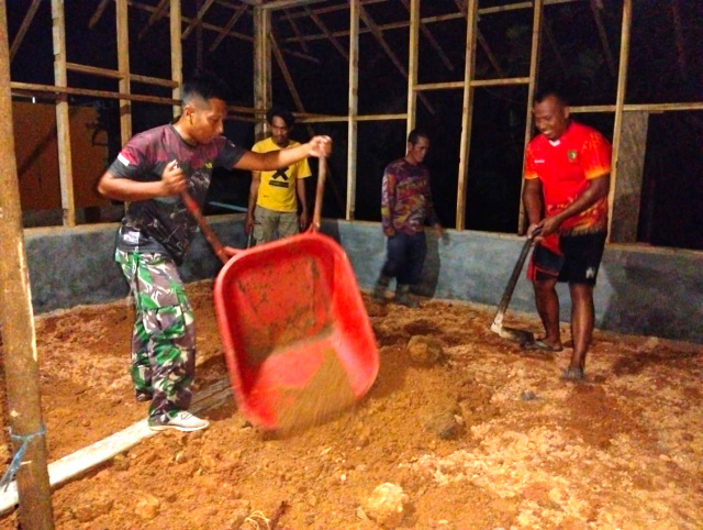 Rehab musala oleh Satgas tidak hanya siang hari, namun juga malam hari. Mempercepat pekerjaan, Satgas dibantu masyarakat setempat.