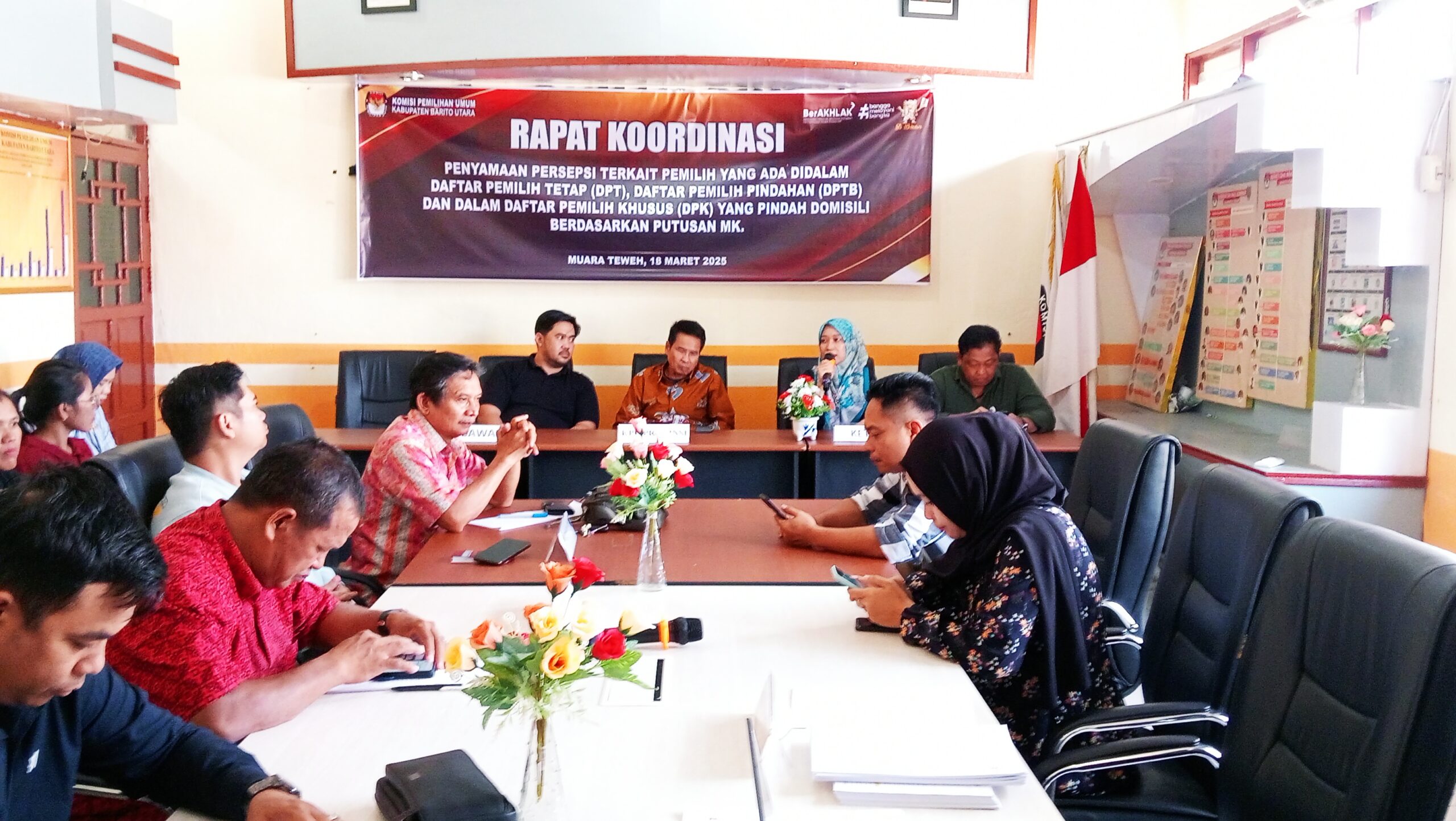 Pada hari ini tanggal 18 Maret 2025, Komisi Pemilihan Umum (KPU) Kabupaten Barito Utara kembali mengadakan Rapat Koordinasi Penyamaan Persepsi terkait Pemilih DPT yang sudah pindah domisili berdasarkan putusan Mahkamah Konstitusi (MK) di Ruang RPP Kantor Sekretariat KPU setempat, sore.