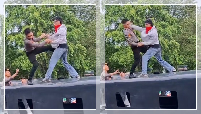 Di tengah kericuhan, seorang mahasiswa tiba-tiba naik ke atas truk polisi dan berhadapan langsung dengan seorang anggota kepolisian. Tak butuh waktu lama, adu mulut berubah menjadi adu jotos. Dalam video yang beredar di akun Instagram @terkinidotid, terlihat keduanya saling melayangkan pukulan dengan sengit, sementara massa aksi di bawah bersorak heboh.