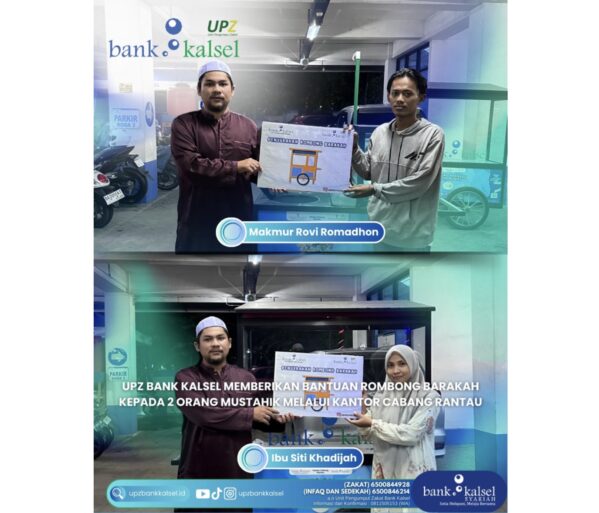 BANJARMASIN, Kalimantanlive.com – Dalam komitmennya mendukung kemandirian ekonomi masyarakat, Unit Pengumpul Zakat (UPZ) Bank Kalsel kembali menyalurkan bantuan Rombong Barakah kepada dua pelaku Usaha Mikro Kecil Menengah (UMKM) di Rantau.