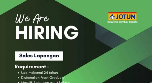 Kalimantanlive.com – Jotun membuka kesempatan karir bagi Anda yang tertarik menjadi Sales Lapangan. Jika Anda memiliki kemampuan komunikasi yang baik, dapat bekerja di lapangan, dan bersemangat mencapai target penjualan, kami mengundang Anda untuk bergabung dengan tim kami.