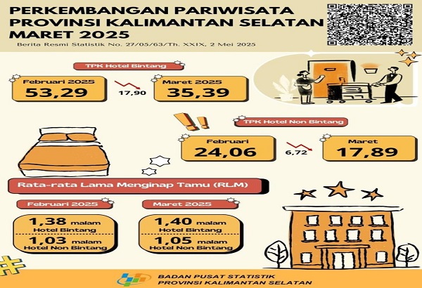 BANJARBARU, Kalimantanlive.com – Badan Pusat Statistik (BPS) Kalimantan Selatan mencatat penurunan signifikan pada Tingkat Penghunian Kamar (TPK) hotel berbintang di wilayah tersebut pada Maret 2025.