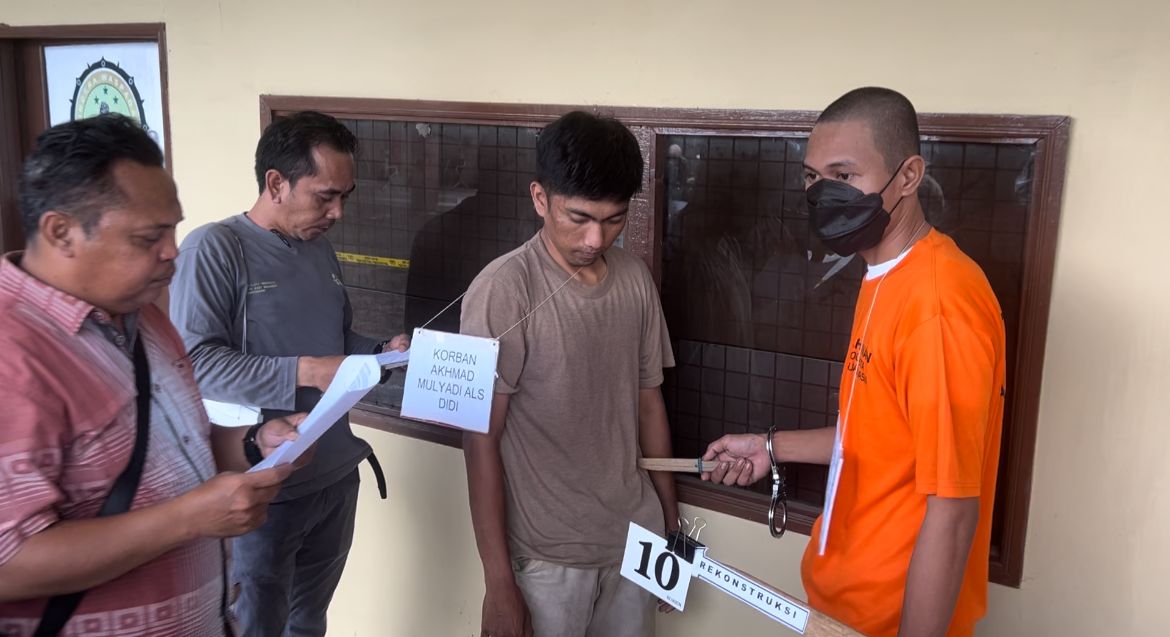 Ada Sebanyak 19 adegan diperagakan tersangka MRS dan MRA, saat menikam Akhmad Mulyadi hingga tewas, yang berlangsung dalam rekontruksi di Halaman Mapolsek Banjarmasin Barat, Selasa (20/5/25).