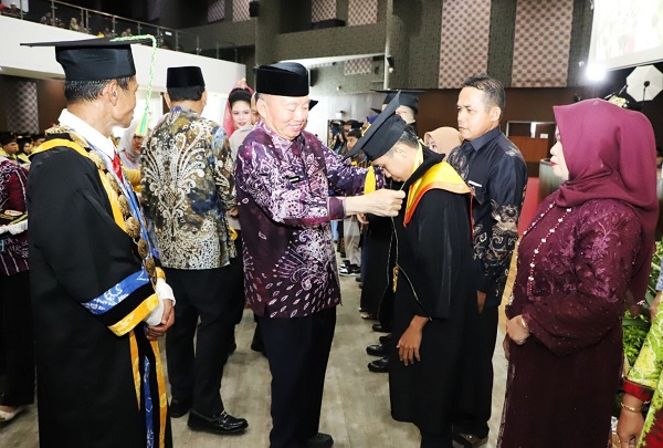 Dalam kegiatan yang dihadiri unsur Forkopimda dan Rektor ULM Prof. Ahmad Alim Bachri, Gubernur Muhidin berkesempatan mengalungkan selendang kepada sejumlah lulusan terbaik dari berbagai jenjang, mulai dari Diploma hingga Doktor.