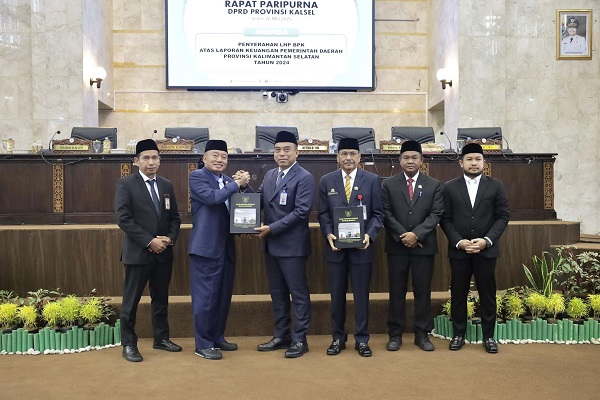Penyerahan Laporan Hasil Pemeriksaan (LHP) dan Ikhtisar Hasil Pemeriksaan Daerah (IHPD) dilakukan dalam Rapat Paripurna DPRD Provinsi Kalsel, Senin pagi (26/5), oleh Staf Ahli Bidang Keuangan Pemerintah Pusat BPK RI, Dr. Ahmad Adib Susilo, kepada Gubernur Kalimantan Selatan H. Muhidin dan Ketua DPRD Kalsel Dr. H. Supian HK, S.H., M.H.