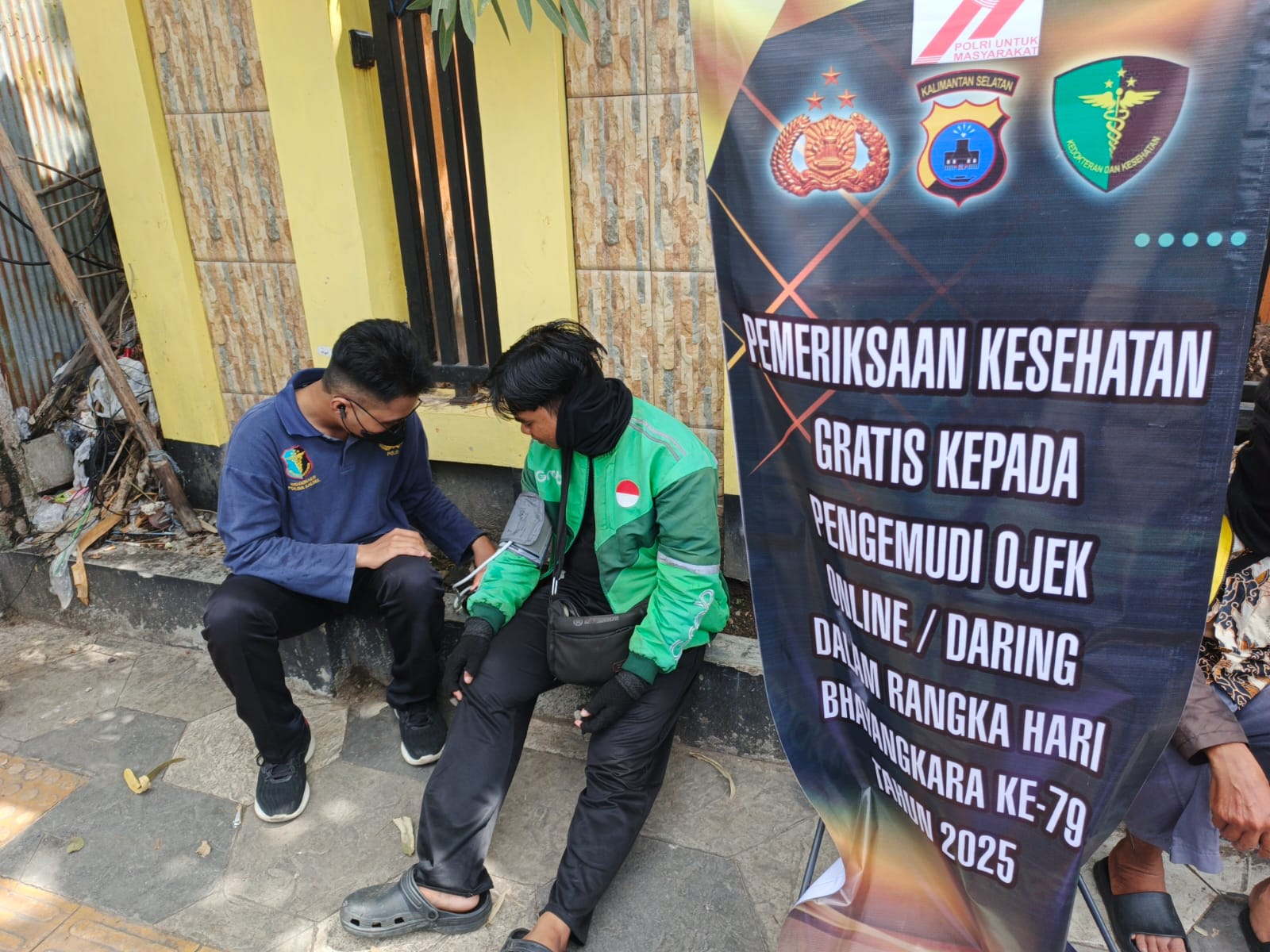 BANJARMASIN, Kalimantanlive.com – Tim Dokkes (Kedokteran dan Kesehatan Kepolisian) Polresta Banjarmasin menyambangi para driver Ojek Online (Ojol) yang mangkal di kawasan Jalan Simpang Ulin, Kamis (12/6/2025) pagi.
