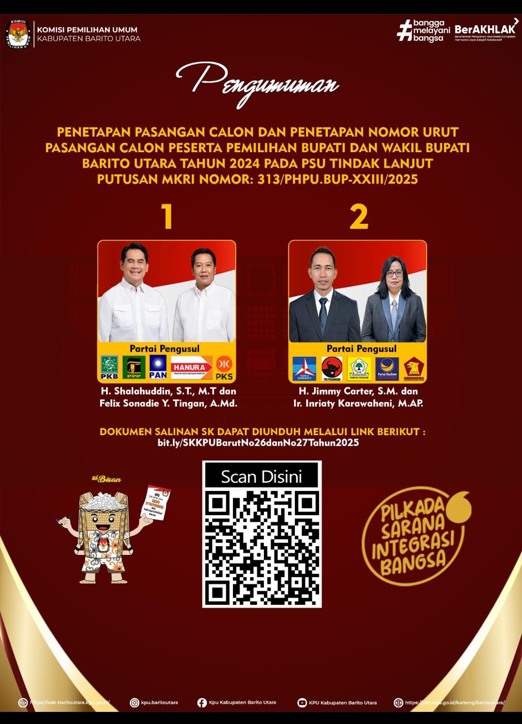 MUARA TEWEH, KALIMANTANLIVE.COM – Komisi Pemilihan Umum (KPU) Kabupaten Barito Utara mengeluarkan Pengumuman Nomor : 273/PL.02.3-Pu/6205/2025 yang menetapkan pasangan calon Bupati dan Wakil Bupati Barut berserta nomor urutnya untuk PSU pasca putusan Mahkamah Konstitusi nomor 313/PHPU.BUP-XXIII/2025.