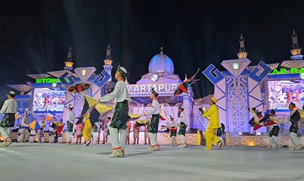 Panggung utama seluas 66×20 meter berdiri megah dengan nuansa lokal Martapura—ornamen replika gerbang Sekumpul, miniatur mihrab Mushala Ar-Raudhah, dan ikon Tugu Intan Berdoa menghiasi latarnya.