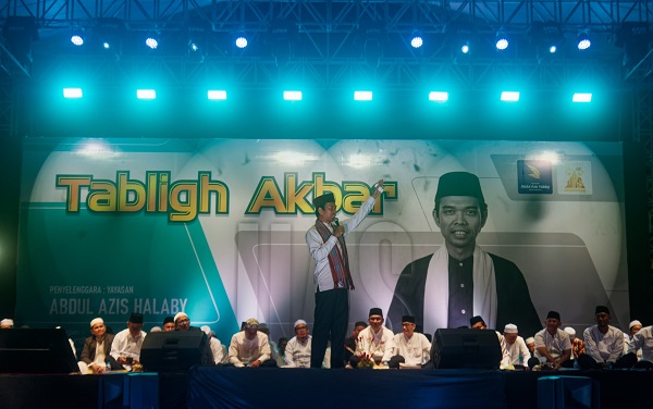 Tablig akbar yang digelar Yayasan Abdul Aziz Halaby ini diawali dengan lantunan syair Maulid Habsyi dan penampilan Madihin Millenial, dilanjutkan pembacaan ayat suci Al-Qur’an oleh Ustaz Syahrudin, sebelum ceramah utama oleh UAS.