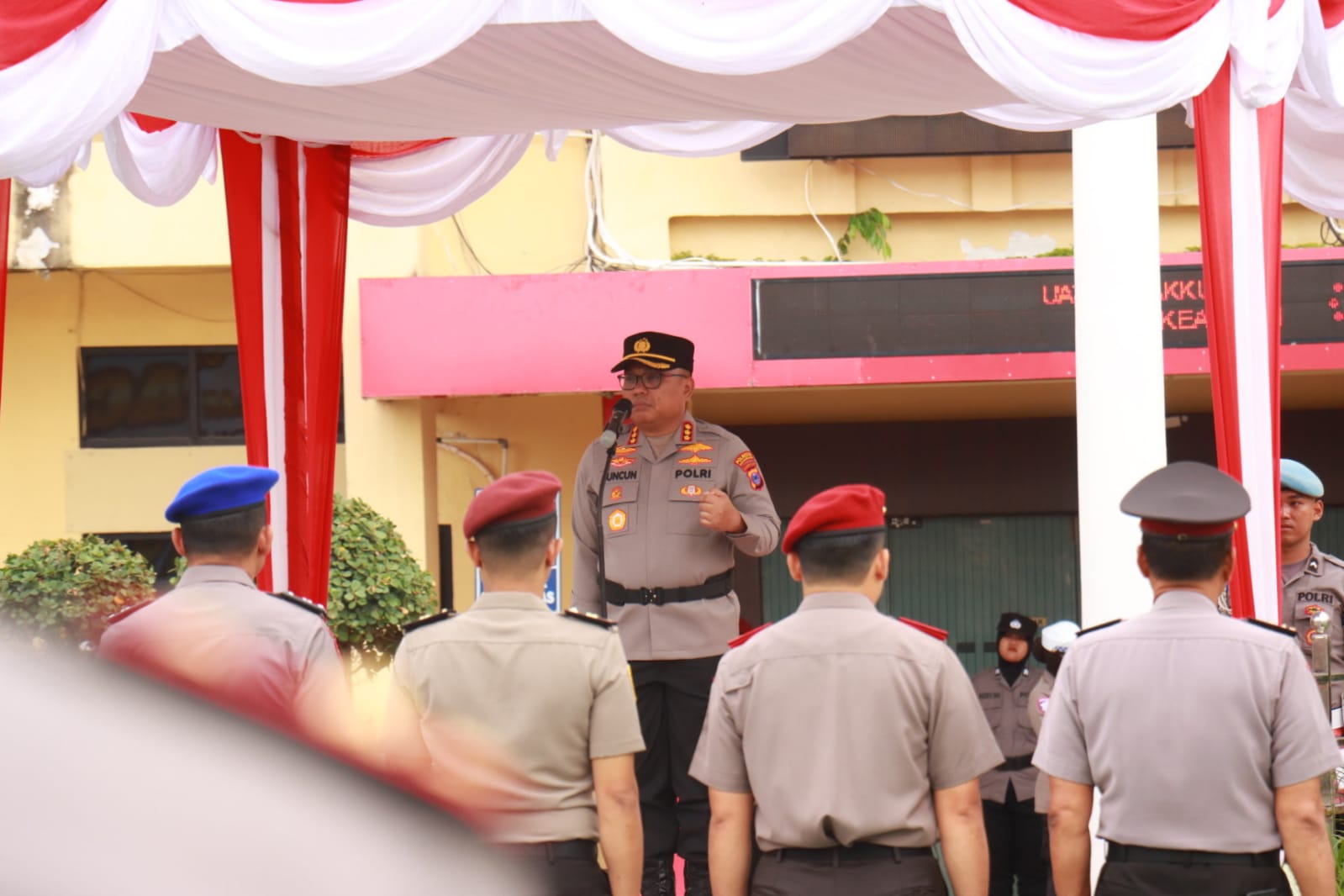 Kapolresta Banjarmasin, Kombes Pol Cuncun Kurniadi, memimpin langsung upacara yang turut dihadiri para pejabat utama, kapolsek jajaran, serta Ketua Bhayangkari Cabang Kota Banjarmasin Ny. Yanti Cuncun Kurniadi beserta pengurus.