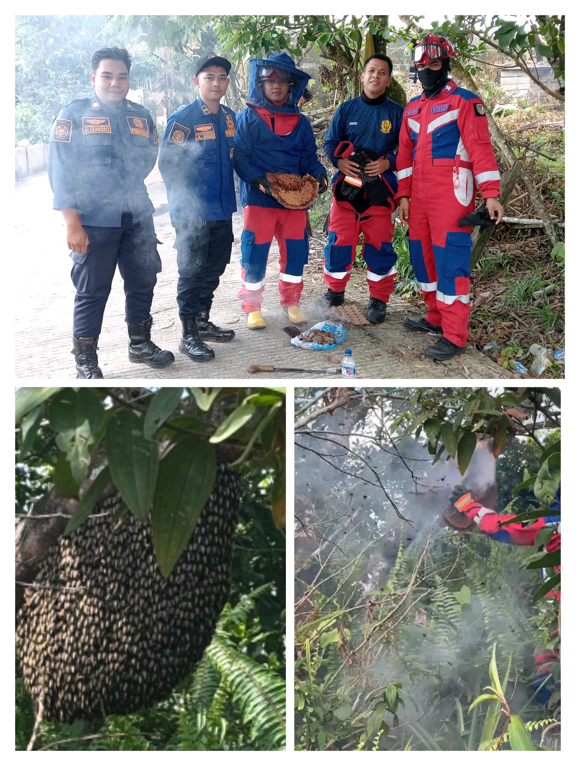 Ribuan ekor lebah tampak mengelilingi dan berusaha menyengat anggota Damkar yang sedang mengasapi sarang itu, namun tentu saja tidak berefek apa-apa berkat pakaian pelindung mereka.
