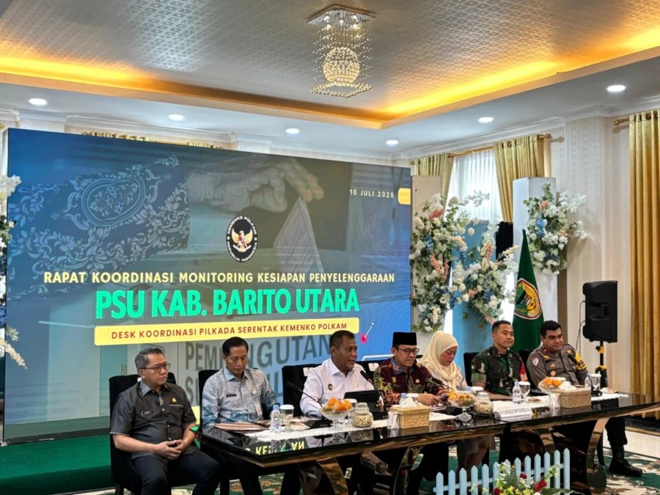 MUARA TEWEH, KALIMANTANLIVE.COM – Diinformasikan melalui SIARAN PERS NO. 173/SP/HM.01.02/POLKAM/7/2025 di laman web resmi Kemenko Polkam RI, Desk Koordinasi Pilkada Serentak Kementerian Koordinator Bidang Politik dan Keamanan (Kemenko Polkam) menggelar rapat koordinasi pada Kamis (10/7/2025) untuk membahas kesiapan penyelenggaraan Pemungutan Suara Ulang (PSU) di Kabupaten Barito Utara, Kalimantan Tengah. Rapat dipimpin oleh Asisten Deputi Koordinasi Demokrasi dan Kepemiluan, Haryadi, selaku Sekretaris I Desk.