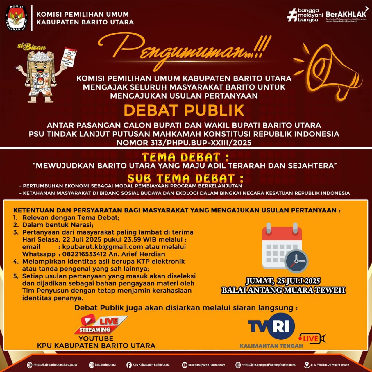 Debat ini akan disiarkan secara langsung melalui channel YouTube KPU Kabupaten Barito Utara dan TVRI Kalimantan Tengah.