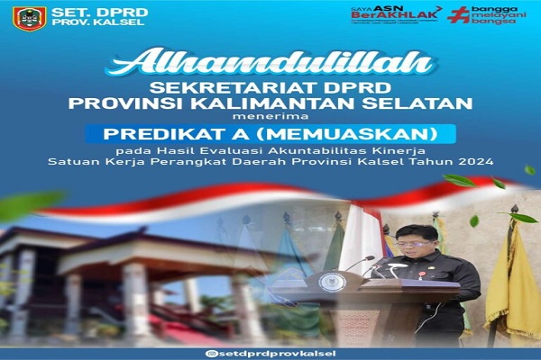 BANJARMASIN, Kalimantanlive.com – Sekretariat DPRD Provinsi Kalimantan Selatan meraih predikat A (Memuaskan) dalam evaluasi Sistem Akuntabilitas Kinerja Instansi Pemerintah (SAKIP) Tahun 2024. Hasil ini diumumkan oleh Inspektorat Daerah Kalsel melalui surat Nomor 700.1.2.1/69.a/ITP/2025.