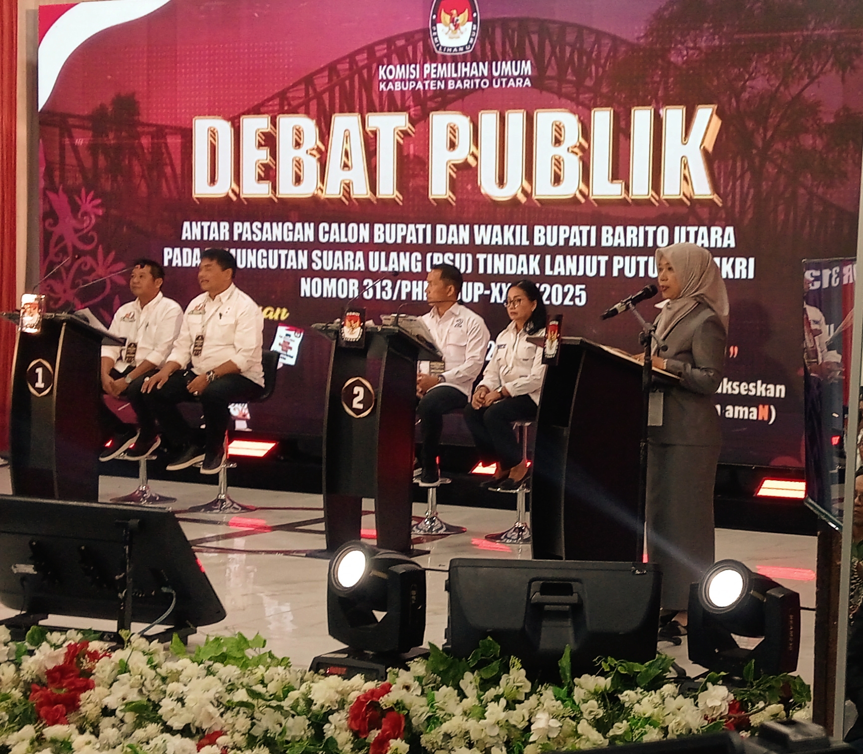 MUARA TEWEH, KALIMANTANLIVE.COM – Memperdalam visi, misi, program serta komitmen dari masing-masing pasangan calon Bupati dan Wakil Bupati Barito Utara jelang Pemungutan Suara Ulang (PSU) 6 Agustus 2025, Komisi Pemilihan Umum (KPU) Kabupaten Barito Utara menggelar Debat Publik di Gedung Balai Antang, Muara Teweh, Malam (25/7/2025).